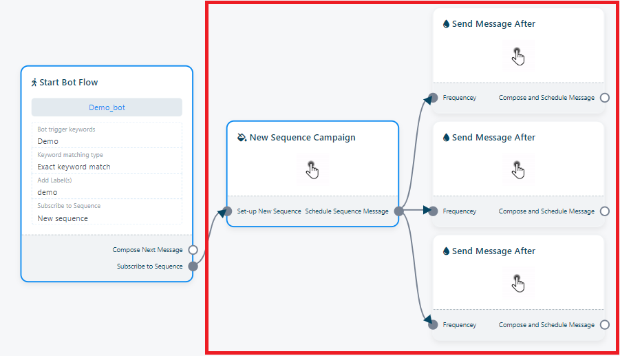 6. Upon completing the previous steps, you will discover three additional S`end Message After` components attached to the `sequence campaign` component.