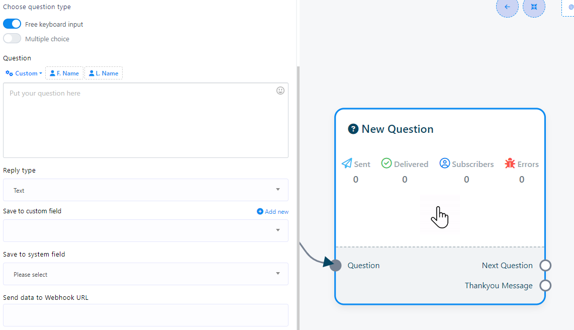 4. Double-click on the `New Question` component to access two buttons: `Free Keyboard Input` and `Multiple choice`. These buttons determine the type of questions you want to ask.