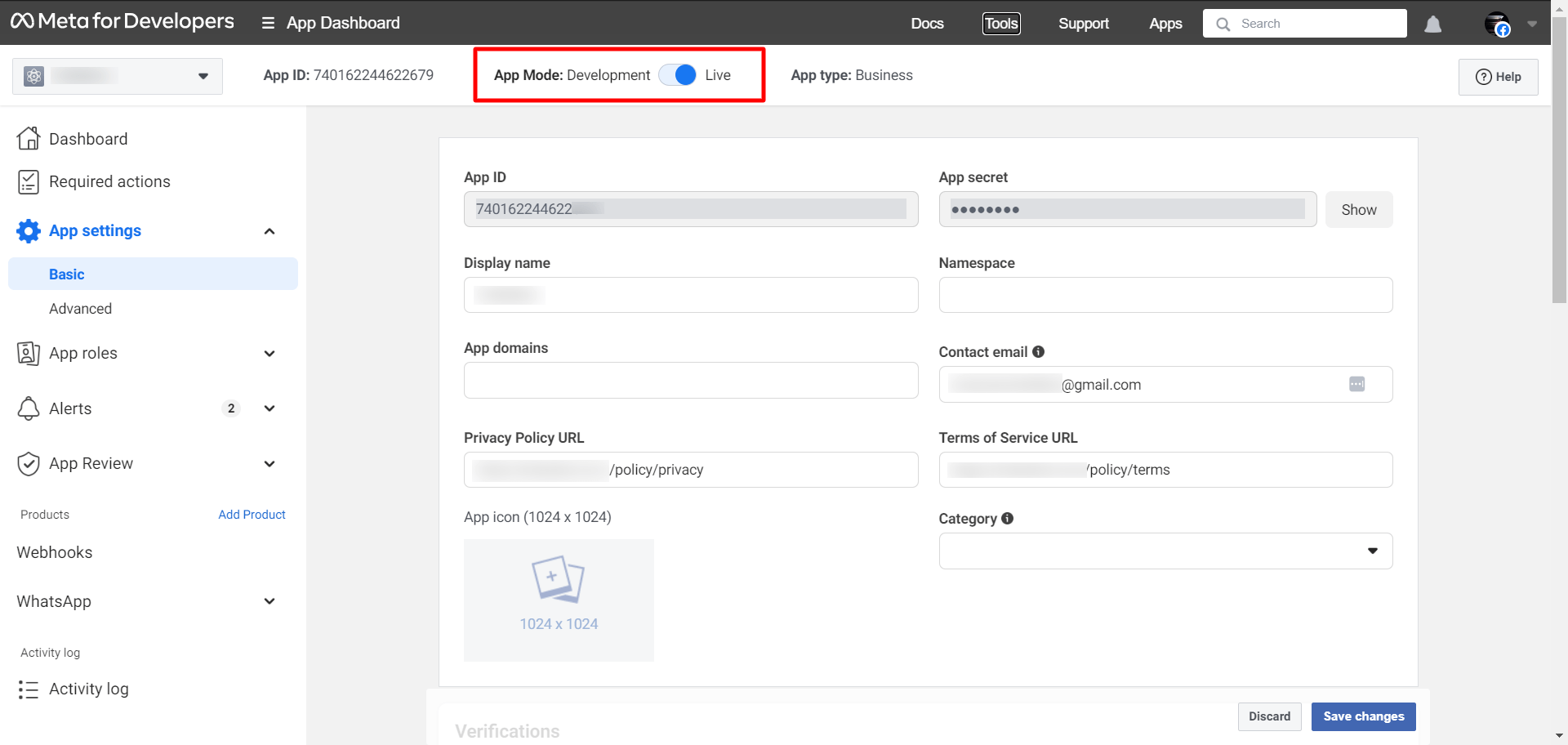Then from the App settings, click on the Basic option and add the Privacy Policy URL and Terms of Service URL from the Chattie. These URLs are available on the Connect bot page of Chattie. After adding these URLs just click on the “Save changes” button.