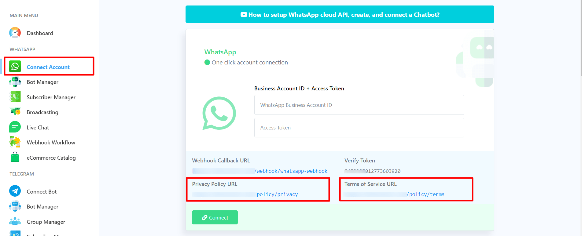 To get the callback URL and verify the token from Chattie. Login to your account and go to the dashboard of Chattie. At the left sidebar of the Dashboard, under the WhatsApp section, you will see connect WhatsApp option. Now click on the connect WhatsApp menu and instantly, Connect WhatsApp Business page will appear.